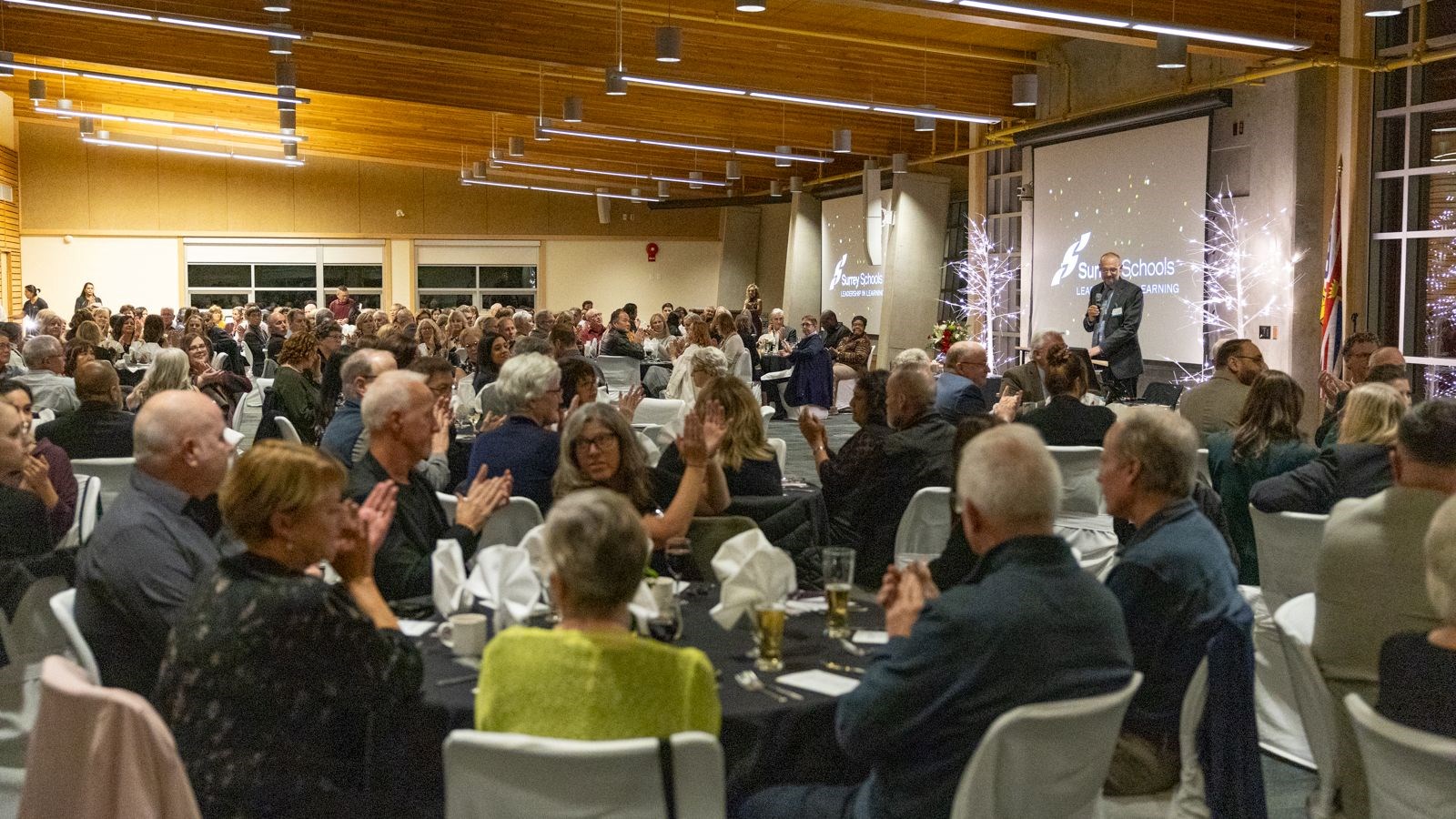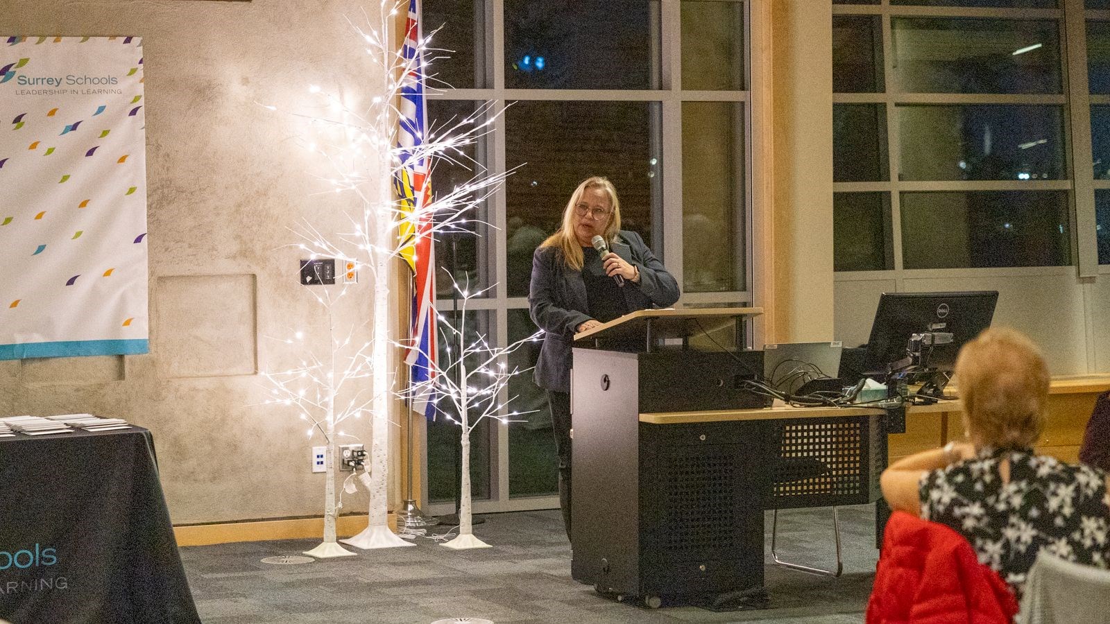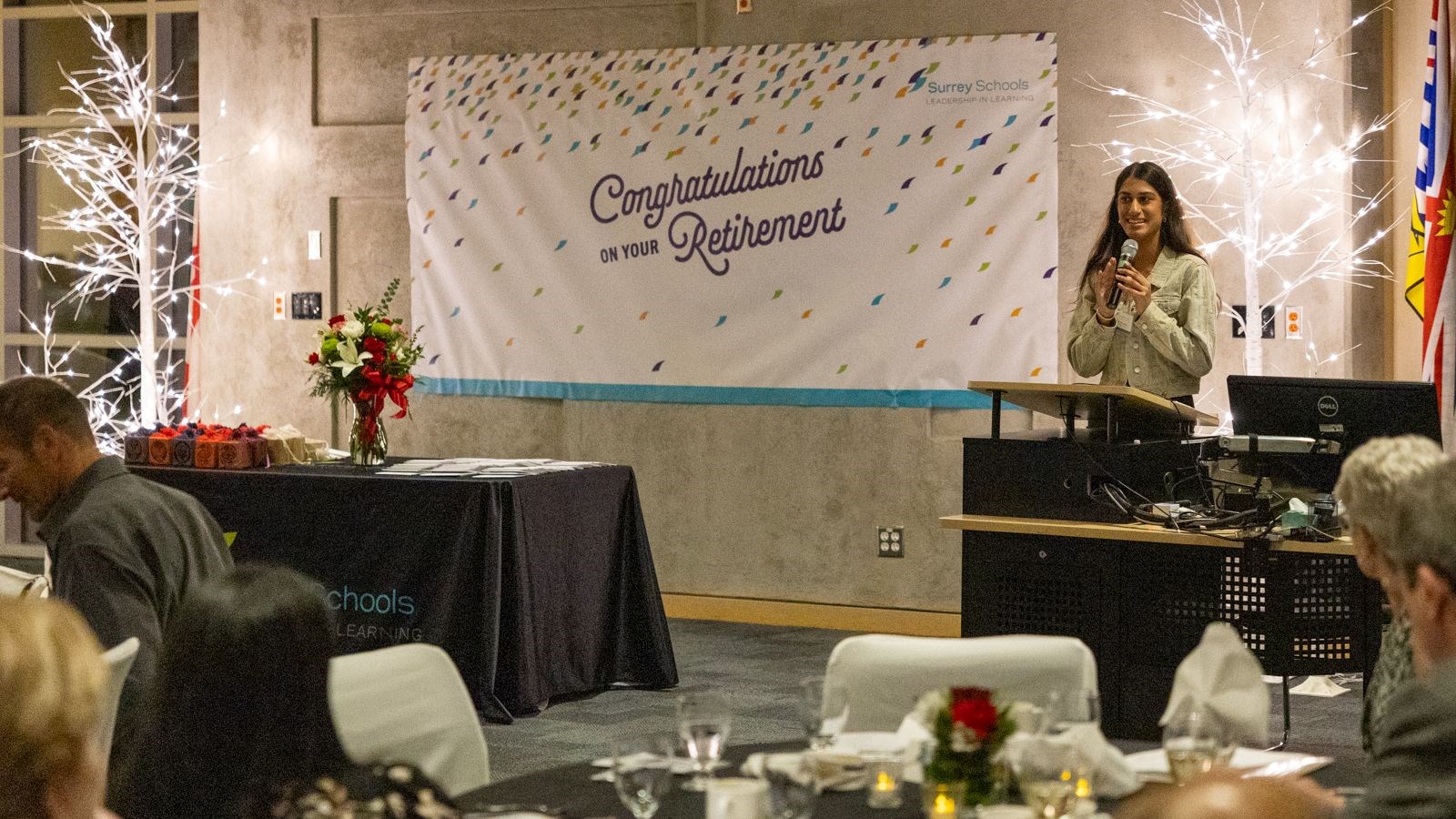 A dinner held at the Resource Education Centre included a territorial acknowledgment from Deputy Supt. Andrew Holland and congratulatory messages from Tymoschuk, Supt. Mark Pearmain, CUPE 728 Vice-President Theresa Pidcock, 宅男社区 Teachers’ Association 1st Vice-President Angela Marcakis, 宅男社区 Principals’ & Vice-Principals’ Association President Graham Magnusson and Grandview Heights Secondary Grade 12 student Zohra Khawaja, who serves on the district’s Student Voice group. It also featured music from the École Kwantlen Park Secondary Jazz Combo.
