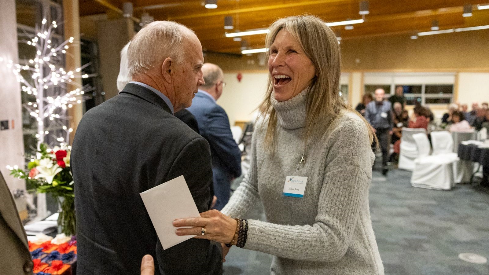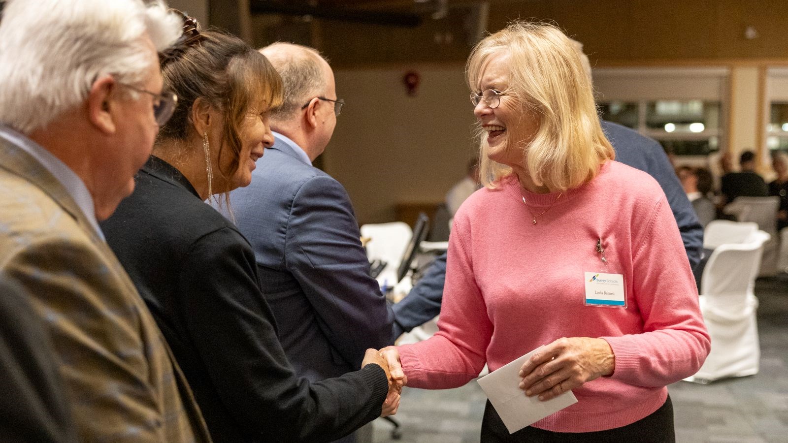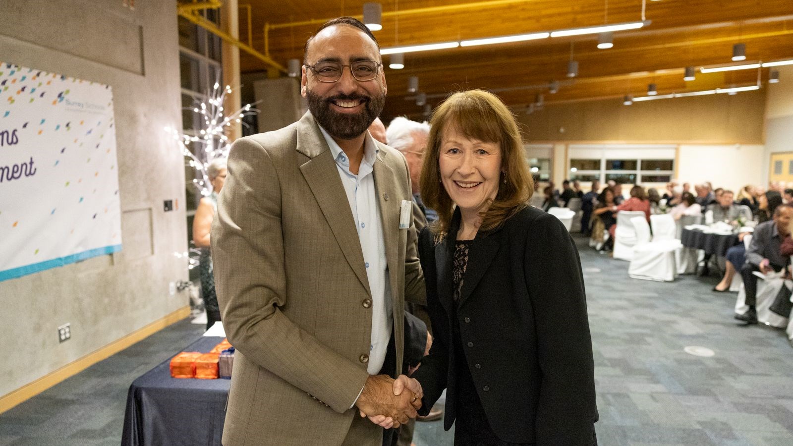 宅男社区 Board of Education Incoming Vice-Chair Garry Thind congratulates Janice Anderson on her retirement. On Thursday, 宅男社区 hosted its annual retirement dinner, celebrating more than 240 staff members who retired in the 2023-24 school year. (Photos by Jacob Zinn)