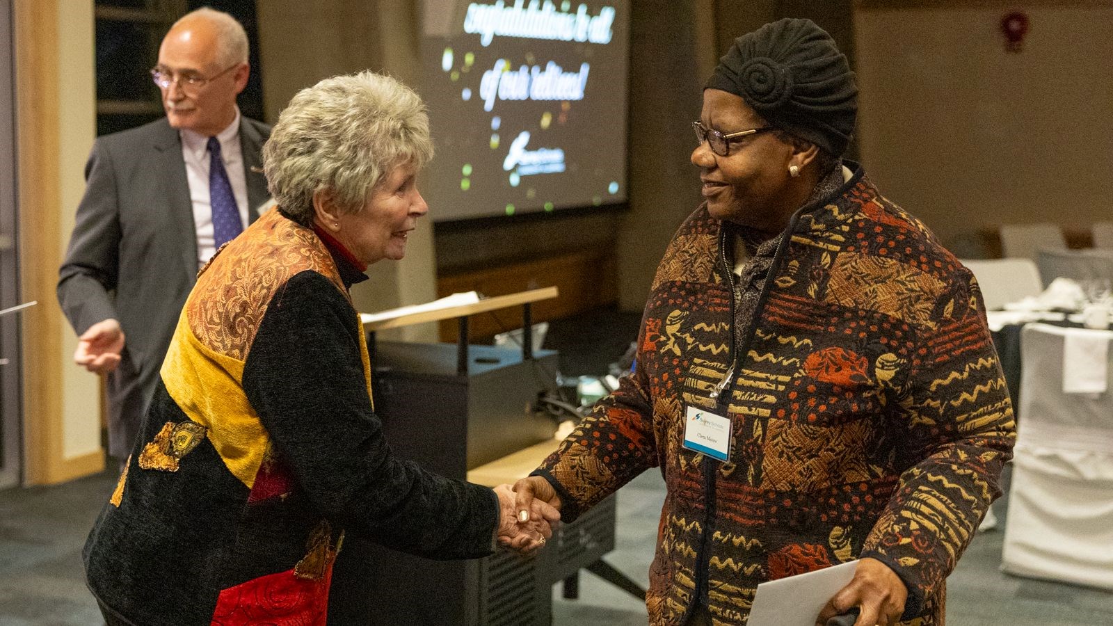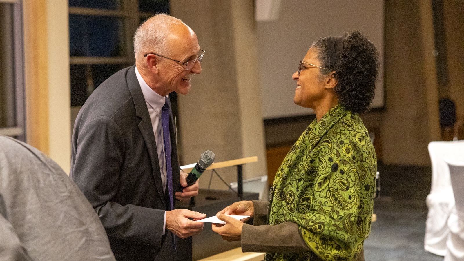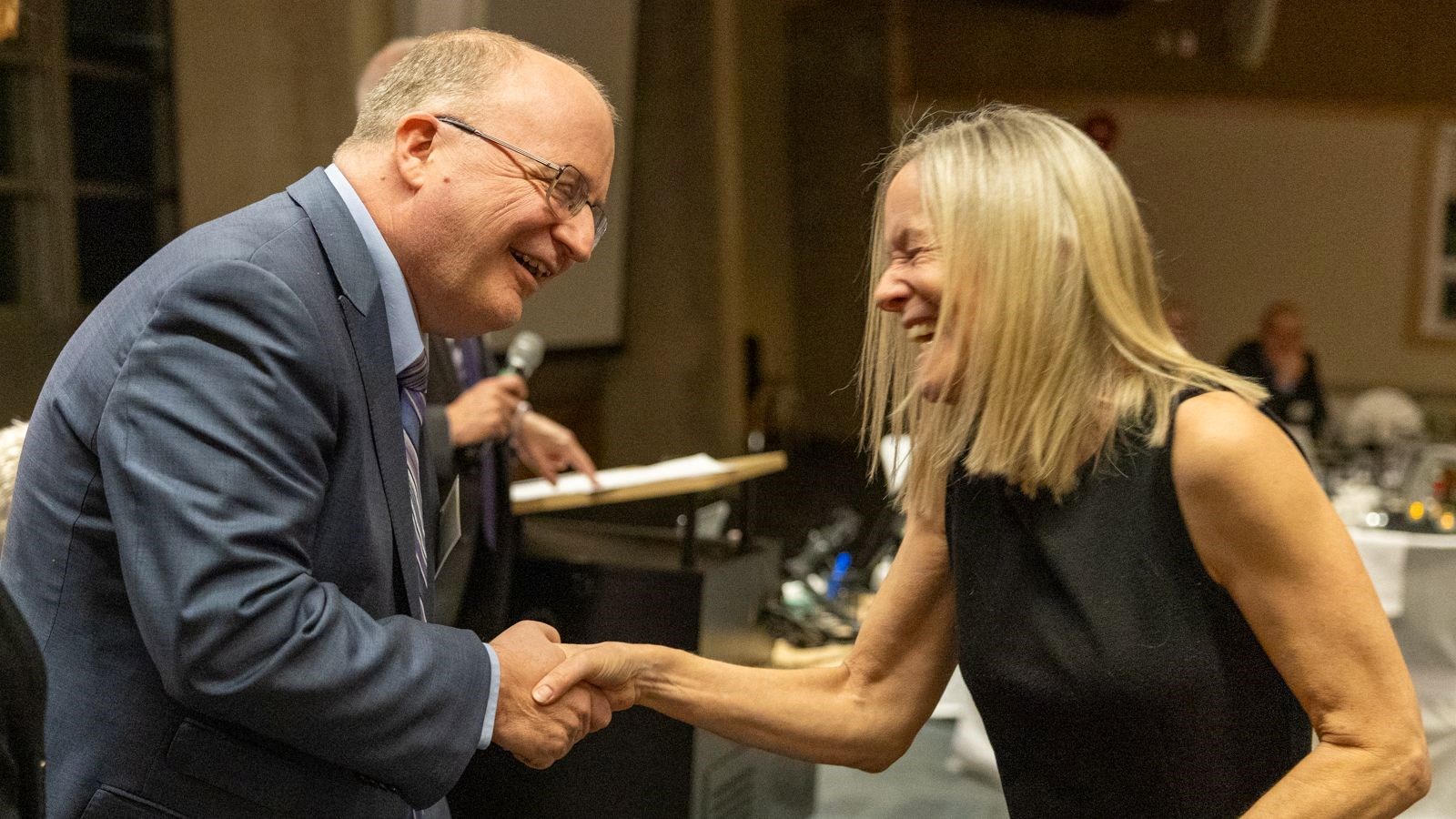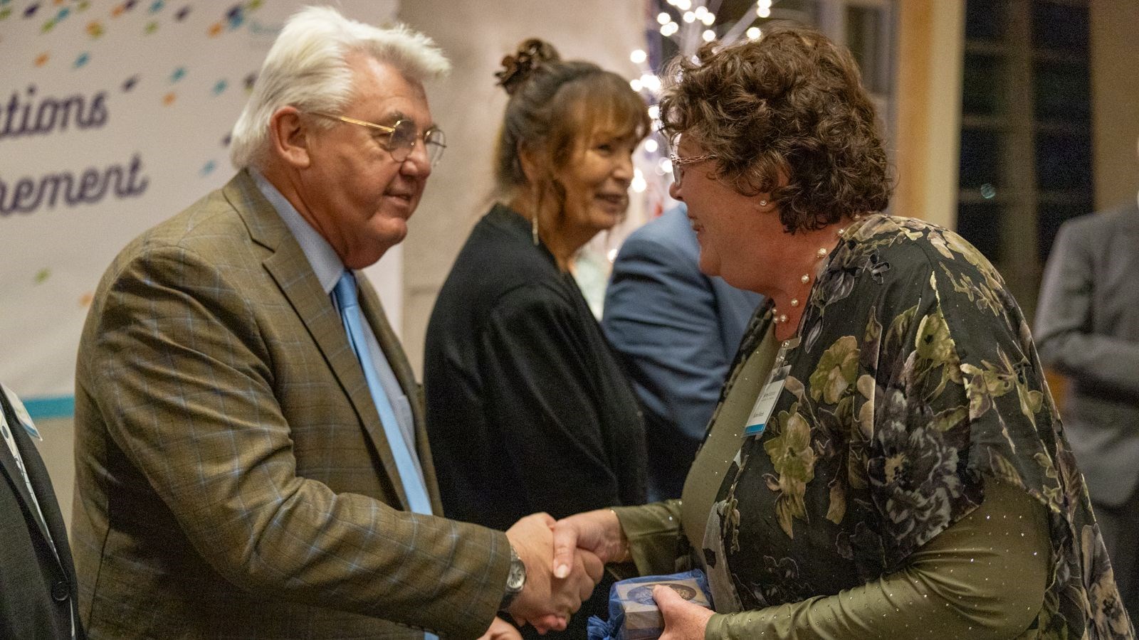宅男社区 Board of Education Incoming Vice-Chair Garry Thind congratulates Janice Anderson on her retirement. On Thursday, 宅男社区 hosted its annual retirement dinner, celebrating more than 240 staff members who retired in the 2023-24 school year. (Photos by Jacob Zinn)